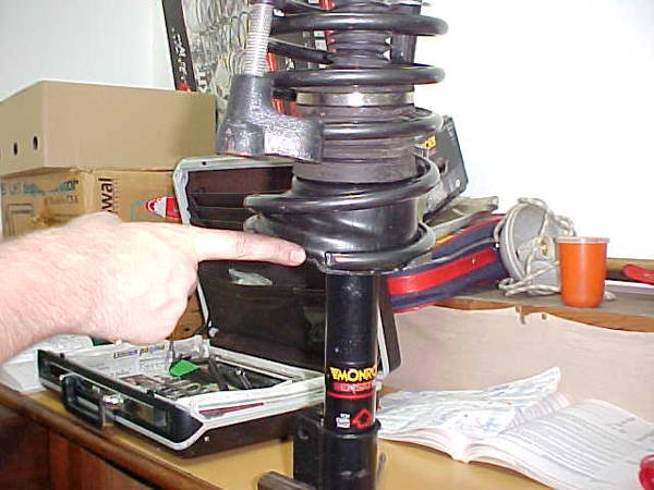 Si únicamente van a reemplazar amortiguadores, mantengan el espiral prensado. Si van a cambiar espirales, liberen al viejo espiral muy lentamente (es un proceso peligroso, ya que si se llega a safar, sale despedido con una fuerza impresionante y pueden perder la mano). Recuerden aceitar la tuerca a medida que aflojan.